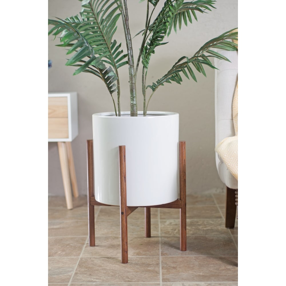 Xxl Mid Century Modern Ceramic Cylinder Planter Pot With Solid Wood Plant Stand The Potted Earth Co